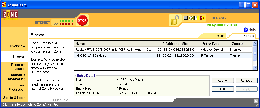 The second entry on the Trusted list was made by me because I have multiple computers networked together and I want to be able to share files and printers between them. When working on customer machines, I often want to be able to download files from my own machines to the customer machine. To do this, I plug the customer machine into my network. Normally, adding an new computer to the network would require me to list it in the Zone Alarm Trusted Zone, before I could access any of my other machines. By setting up a range of valid IP addresses in advance, I just plug in the customer machine and I'm ready to go.