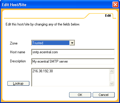 To enable email access to Ecentral email, I made three "Trusted Zone" entries, one to access Ecentral itself (my actual Internet connection) and one each for Ecentral's POP and SMTP servers, as follows:
