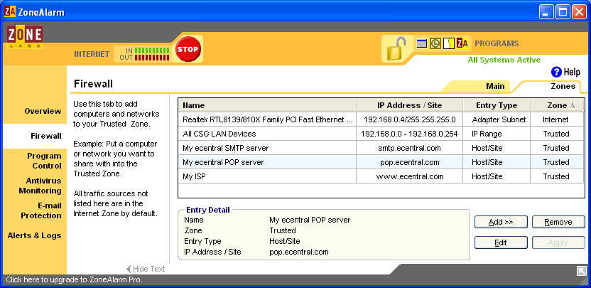 To give you a real-life example, I documented the installation of a firewall on my own personal computer. I use an excellent one called Zone Alarm. As of this this writing, itIt is FREE to individual users. I downloaded it over the Internet and installed it in a matter of minutes. Once the firewall was installed, I was no longer able to send and receive email. The Firewall was blocking my access to my Internet Service Provider (ISP) and to their email servers. What is documented here are the steps I took to correct this problem. While this was not the only thing I had to do, it does illustrate the concepts of how firewalls work and why you have to tell a firewall what you want it to do.